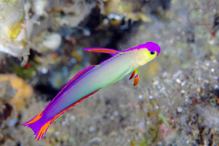 آتش ماهی بنفش مانند سایر گروههای آتش ماهی ، دارای یک باله بلند و کشیده در پشتش است که برای برقراری ارتباط با سایر آتشماهیان و قفل کردنشان به حفرها و شکافها بهکار میرود .این ماهی بنفش نام خود را از وجود نشانههای بنفش و قرمز روشن روی بدنش گرفته است و آنها تا طول 5 سانتیمتر رشد میکنند. این ماهیها از کف غذا گرفته و از پلانکتونها و سختپوستان کوچک تغذیه میکنند.